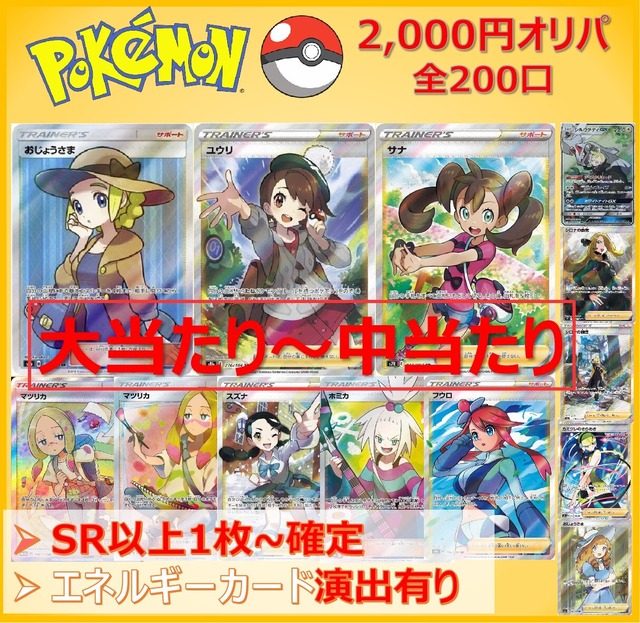 数あるショップの中から「ellyのオリパ屋」の商品をご覧いただきありがとうございます。 皆様に楽しんでいただけるオリパ屋を目指しています。よろしくお願いいたします。 【残り口数】 2023/7/7 :137口 2023/11/30:131口 【エネルギーカード演出有】2,000円オリパ(SR以上確定) ◆1口2,000円 ◆1口1-2枚入り全200口 ◆送料は一律250円 ◆口数制限無し ◯大当たり おじょうさま SR (100/094) ユウリ SR (276/184) サナ SR (077/067) ◯中当たり マツリカ SR (056/050) マツリカ SR (198/173) スズナ SR (113/098) ホミカ SR (197/173) フウロ SR (195/190) おじょうさま SR (114/100) カミツレのきらめき SR (113/100) シロナの覇気 SAR (239/172) シロナの覇気 SR (114/100) シルヴァディGX SR (065/049) ◯小当たり 3枚目の画像参照 ◆ハズレ枠はSR以上となっております。 ◆画像以外の当たりも封入しております♪ ●ファースト賞①:販売開始24時間5%オフ・・・終了 ●ファースト賞②:(5口以上ご購入の先着5名様)デッキシールドx1+Joshin産パックx3(共にランダム) 一人目:6/12済 二人目:6/13済 三人目:6/13済 四人目:6/23済 五人目:6/26済 ★カード保護 透明スリーブ+カラースリーブ+ローダ+クリアシールバッグ 【注意事項】 ※カードの状態について ・オリパの商品はすべて中古品になりますので傷、折れ、凹みなどがある場合がございます。完美品を求める方はご購入をご遠慮下さい。 ・本オリパは主にプレイ用という認識のもとご購入を検討して下さい。 ※カードの内容について ・シャッフルの上購入口数分選択するため内容に偏りがある場合がございます。お目当てのカードが当たらなかった等、内容で評価するのはご遠慮ください。 ・封入価格評価はカードラッシュさんの販売価格、無ければメルカリ価格を参考にさせて頂いております。 ・レギュレーションD以前のカードも含まれます。 ・SR以上=SR、SSR、HR、UR、CSR、SAR ※発送・お支払いについて ・郵便番号、住所を購入時にお間違えないようにお願いします。 ・発送後の事故は保証できません。ポスト投函のため時間指定はできません。 ・発送は当日~3日以内(原則スピード発送を心がけています) ・発送が金曜日・祝祭日前ですと届くまでに多少時間がかかる可能性がございます。 ・入金後の返金はできません。 ご不明点ございましたらお気軽にお問い合わせください。 誠心誠意対応させていただきますのでよろしくお願いいたします。 ********************** 古物商許可証 京都府公安委員会 第611282230057号 **********************
